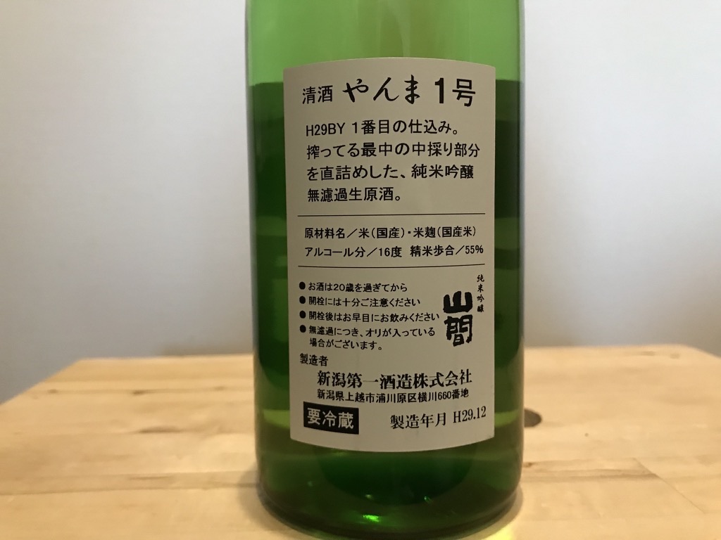 2018-01-24 日本酒 山間 1号 中採り直詰め 純米吟醸無濾過生 新潟第一酒造 外飲みでは飲んだことあるの山間、1号と5号が売ってたのですが、1号の方を買ってきました。 ガス感があり、フタを開ける時に毎回プシュっと 香りは青りんごっぽさがふわっと香ります 口に含むとフルーティーな甘さのあとに酸味がズバッと。 すこし温めてみましたが、味わいはそれほど変わらず美味しかったです。 精米歩合:55% アルコール数:16%