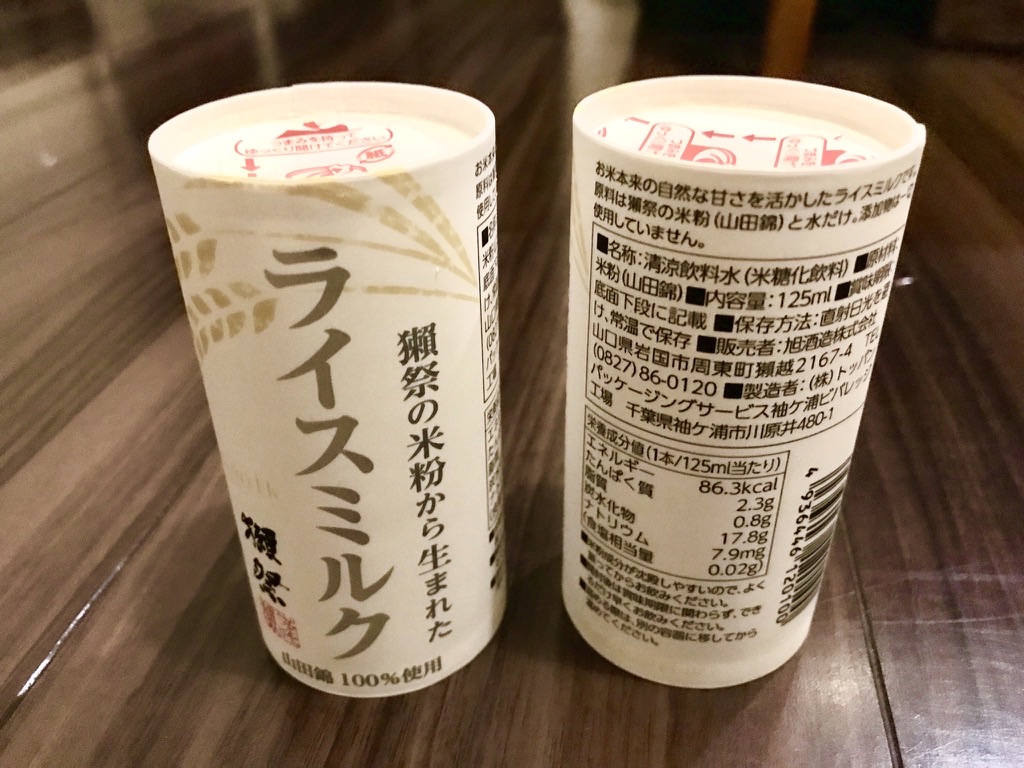 2017-06-25 その他 獺祭の米粉から生まれたライスミルク 名前の通り、獺祭の米粉のドリンクです。 米粉しか使ってないのに、甘いのが不思議です。 この甘さは米粉が糖化した甘さらしいです。 まずいわけではないけど、すごく美味しいものでもないです。 料理に使ったりしたらいいかも