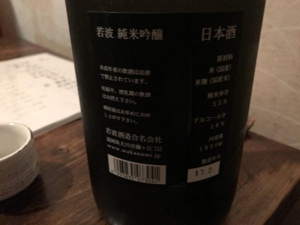 2017-07-21 日本酒 若波 純米吟醸 2杯目は若波です。若波はロゴがキャッチーですよね。 1つ前の而今と比べると酸が立つ感じがします。 甘酸スッキリって感じ 精米歩合:55% アルコール数:16%