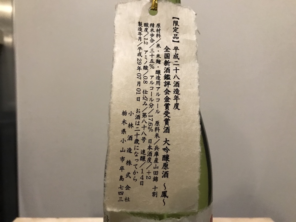 鳳凰美田の限定品で全国新酒鑑評会金賞受賞酒です。