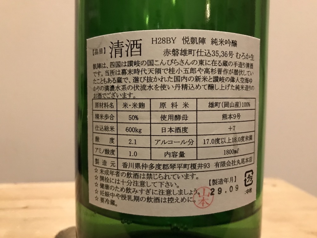 2018-01-05 日本酒 悦凱陣 純米吟醸 無濾過生 赤磐雄町 丸尾本店 悦凱陣の赤磐雄町です。本当は神力が欲しかったのですが、なかったため代わりにこちらを。 4号瓶ではなく1升瓶です。 香りは果実香がほんのり そこまで強くないです 味わいはパンチがあるというかパワーがあるというか重量感ある感じですね。 数値的には辛酸ですが、そこは綺麗にまとまっていて飲みやすくもなっています。 使用米:雄町 精米歩合:50% 使用酵母:熊本9号 日本酒度:+7 酸度:2.1 アミノ酸度:1.0 アルコール数:17~18%