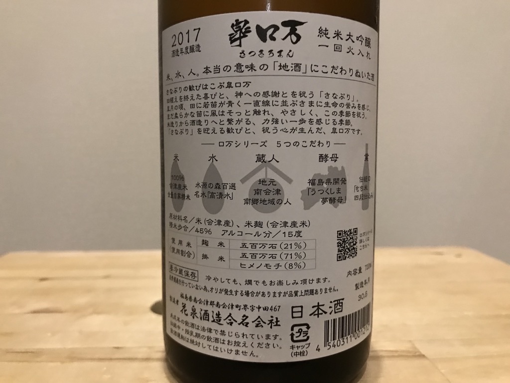 2018-05-21 日本酒 皐ロ万 純米大吟醸 一回火入れ 外飲みでは何度かあるのですが、実際買ったのは初めてのロ万 トロピカルでジューシーな気分だったので、買ってきました。 フルーツっぽい香りムンムンかと思いきや、アルコール香が立ちますね。 口に含むと甘みが広がります。酸味辛味はあまりなく甘みが強いです。 五百万石なので、さっぱり目かなと思ったのですが、結構こってり目 果実感の甘さって言うより、シロップ的な甘さです でも嫌な感じではなく、自分は好きです。 使用米:五百万石、ヒメノモチ 精米歩合:45% アルコール数:15%