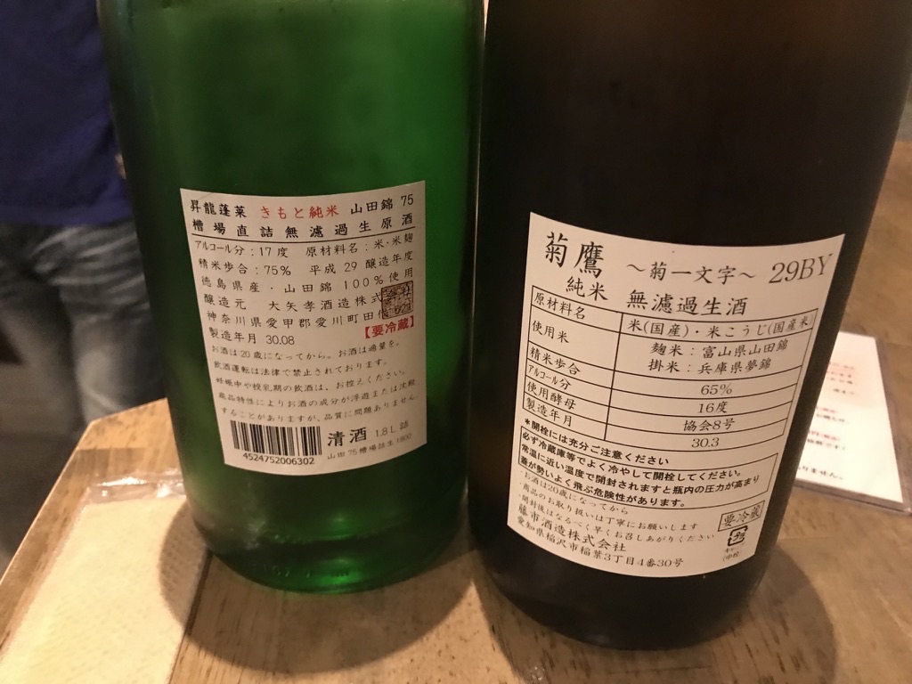 2018-09-24 日本酒 菊鷹 菊一文字 純米 無濾過生酒 秋あがり 昇龍蓬莱 生酛純米 槽場直詰生原酒 左側の黄色い菊鷹です。 めずらしい協会8号酵母を使っています。 華やかでこってり甘み強めの美味しいお酒でした。 右側の昇龍蓬莱は甘みは程々にすっきり辛口な味わい。 個人的には菊鷹のが好きかな ・菊鷹 使用米:麹米 山田錦 掛米 夢錦 精米歩合:65% 使用酵母:協会8号 アルコール数:16% ・昇龍蓬莱 使用米:山田錦 精米歩合:75% アルコール数:17%