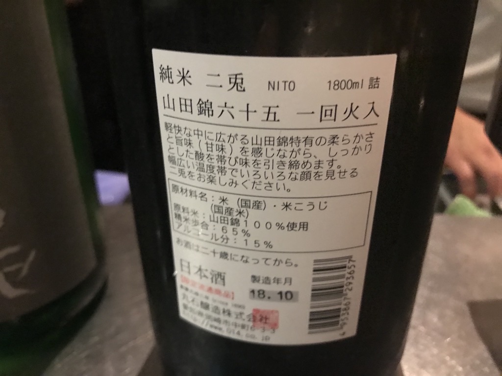 2019-02-25 日本酒 二兎 純米 山田錦六十五 一回火入 丸石醸造 田中六十五みたいな名前 去年なので、正直味は覚えてない。 甘酢っぱって感じだったと思う 使用米:山田錦 精米歩合:65% アルコール数:15%