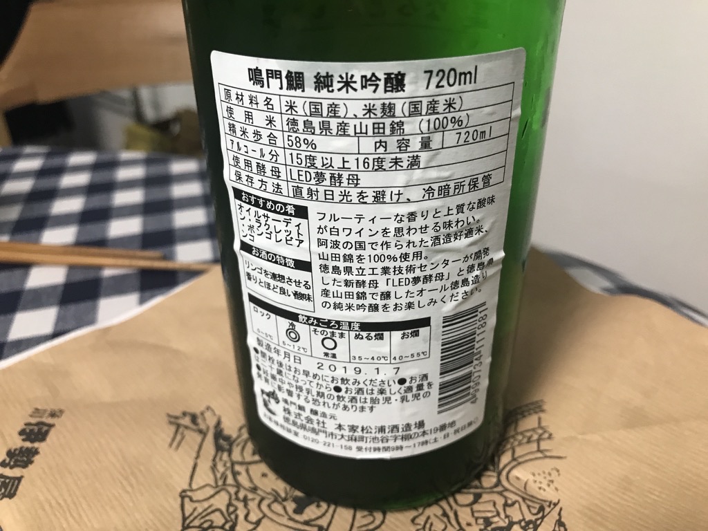 2019-05-13 日本酒 鳴門鯛 純米吟醸 本家松浦酒造場 熱燗が似合いそうなデザインですが、酒質は真逆 香りはりんごで、味わいは、酸味、甘みが強め、とてもフルーティーで飲みやすいお酒でした 使用米:山田錦 精米歩合:58% 仕様酵母:LED夢酵母 アルコール数:15~16%