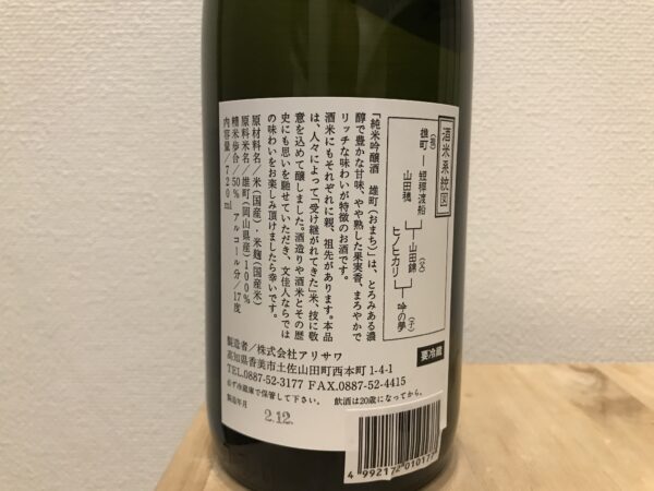 2021-02-24 日本酒 文佳人 雄町 純米吟醸 氷温三年貯蔵 アリサワ 3年貯蔵ってことでちょっと熟成されてそうなお酒 ラベル的にもいい感じの渋さがあって、美味しそう 香りは、フルーツ香、なんだろマスカット的な 味わいはフルーツっぽい甘みもあるんだけど、米の甘み旨味みたいのを感じる 熟成感はよくわからない 温度が上がってくると角がとれてまろやかになってくる 常温以上のがいいのかも 使用米:雄町 精米歩合:70% アルコール数:17%