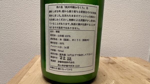 2023-03-21 日本酒 桃の里 純米吟醸 ふなくち 生 ちょっと前のあらばしりと一緒に買って、去年も買って、去年はしろうまより好みだったふなくち 今年は去年よりアルコールが1%高い あと去年は書いてなかった使用米 やっぱアルコールが高くなったからか、個人的には去年のふなくちや今年のしろうまのほうが好き 毎回スペックが微妙に違うので、WEBサイトにせめてアルコール数くらいは書いといてほしいなと思う。 使用米:山田錦100% 精米歩合:55% アルコール数:14%