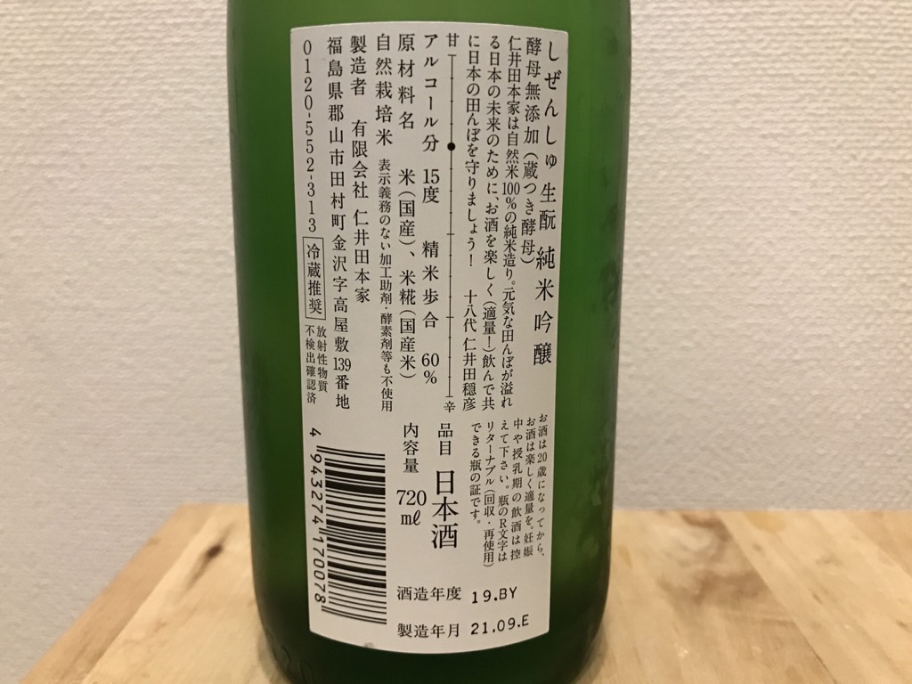 2021-10-22 日本酒 にいだしぜんしゅ 生酛 純米吟醸 仁井田本家 酵母無添加の生酛です。 まずは冷やして 香りはなんだろ、よくわからない 色はほんのり黄色みががっている 味は白ワイン的な印象 かといってそこまで酸味を強く感じるわけでもなく、辛味もほぼない なんか不思議な感じ 温度が上がってくると、旨味が増してくる感じで、白ワイン的な要素は薄れて、甘み、酸味、辛味が膨れてくる なかなかうまく言い表せないお酒 精米歩合;60% 酵母:蔵付き酵母 アルコール数:15%