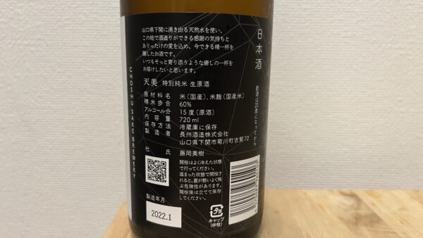 2022-04-21 日本酒 天美 特別純米 生原酒 長州酒造 最近ちょっと有名な天美 勝手なイメージで甘酸な白ワイン的なお酒かな、なんて思いながら購入した ちょっとガス感 香りはそこまで 甘みより酸味が先に来て甘みはその後 甘くないわけじゃないんだけど、酸のせいか甘みが少なめに感じる 個人的には、この酸味があまり好きじゃないかな 精米歩合:60% アルコール数:15%