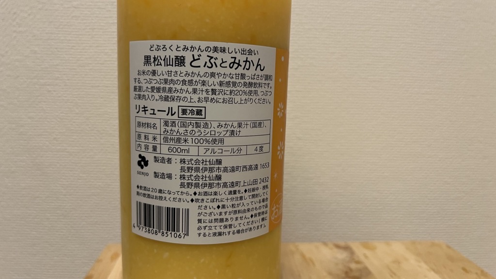 2024-08-21 その他 黒松仙醸 どぶとみかん 雷鳥がみかん被ってるイラストがかわいい、どぶとみかん ポンジュース+甘酒+アルコールって感じでほぼジュース もろみの米感とみかんのつぶつぶが残ってるので、どろどろとした口当たり アルコール少ないし結構好き アルコール数:4%