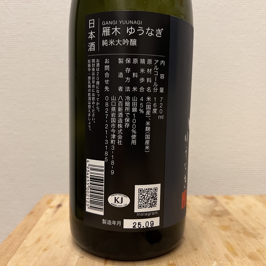2025-12-17 日本酒 雁木 ゆうなぎ 純米大吟醸 久々の雁木のゆうなぎ 開栓したてはまさにリンゴジュース 開栓してちょっと経つと、アルコールが立ってくるので、早めに飲み切るのが良い 原料米:山田錦100% 精米歩合:45% アルコール数:16%