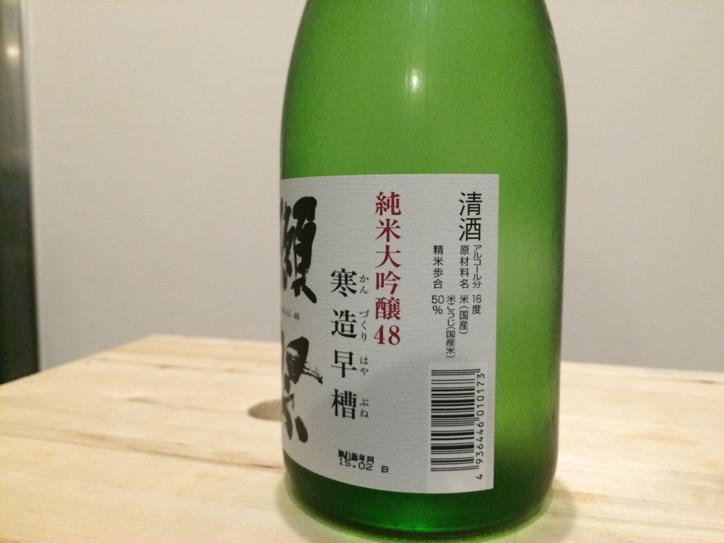 2015-02-22 日本酒 獺祭 純米大吟醸48 寒造早槽(かんづくりはやぶね)生酒 旭酒造 獺祭の冬季限定のお酒です。 48と言うのは三割九分と50のブレンドらしいです。(精米歩合は50%って書いてあるけど) 甘みがあって後味すっきりです。 若干レギュラー獺祭より角が立つ感じかな。新酒だからかも。 使用米:山田錦 精米歩合:50% 日本酒度:+5.0 酸度:1.3 アルコール数:16%