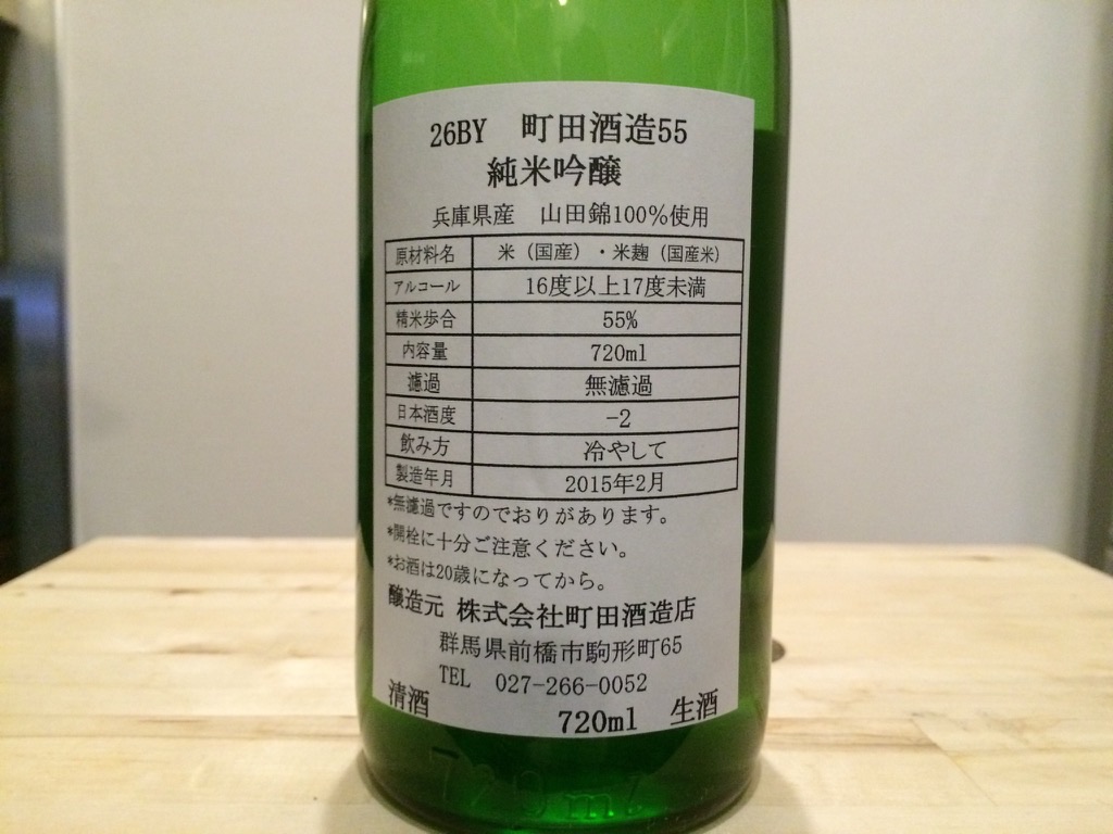 2015-04-25 日本酒 町田酒造 純米吟醸55 直汲み 香りはリンゴ系の香りがして、うっすらとオリが絡んでいます。 味わいは甘くてフルーティー とても飲みやすいです。 あっという間に空いてしまいました。 使用米:兵庫県産 山田錦 精米歩合:55% 日本酒度:-2 アルコール数:16~17%