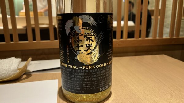 2023-01-16 日本酒 栄光富士 純米大吟醸 79AU PURE GOLD お寿司屋で甘口でおすすめは?って言ったら候補の一つとして出てきたお酒 79は金の原子番号でAuは元素記号らしい 金粉がすごい まるでスノードーム 味わいは甘くてトロピカルフルーツで自分好み 使用米:八反錦 精米歩合:50% 酵母:山形酵母 日本酒度:-4 酸度:1.5 アミノ酸度:0.7 アルコール数:16.3%