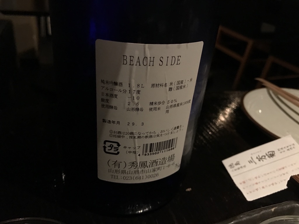2017-04-01 日本酒 BEACH SIDE 秀鳳 季節外れな名前ですね スペックを見る限りマニアックな感じがします 前2つの阿櫻、竹葉と酒質は似てますが、もうちょっと甘酢っぱくした感じのお酒でした 精米歩合:50% 日本酒度:-10 酸度:2.6 使用酵母:山形酵母
