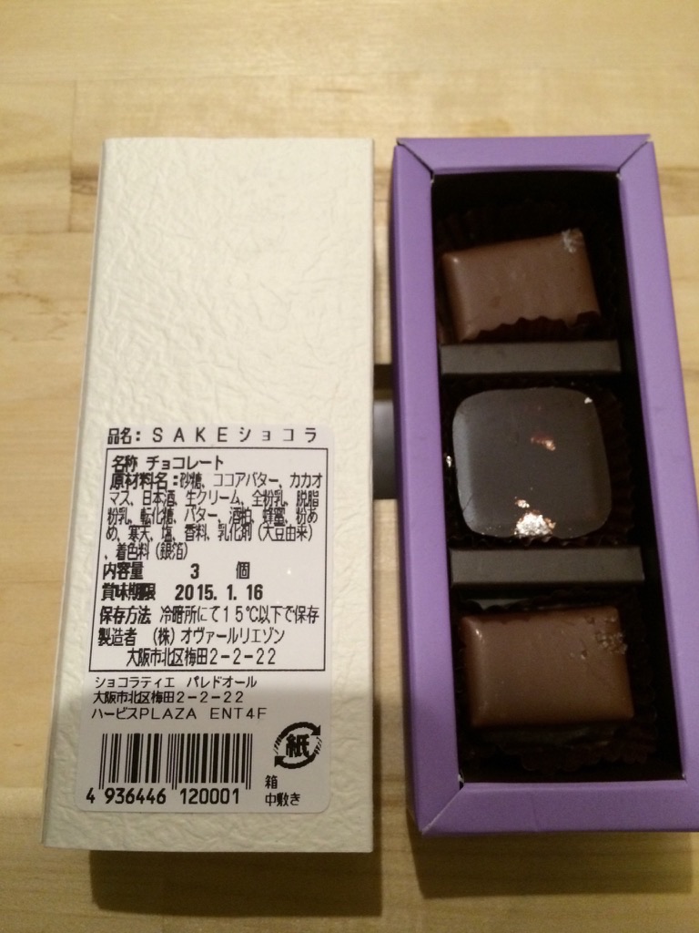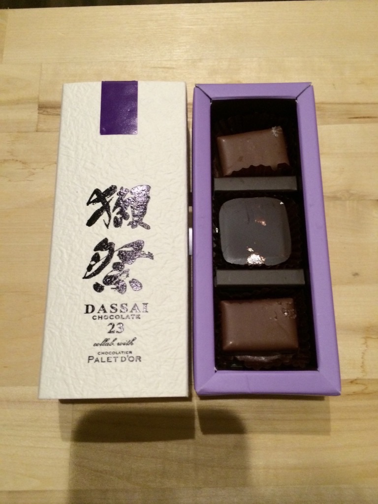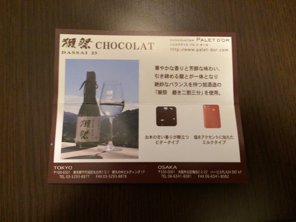 2015-01-02 チョコレート 獺祭ショコラ by PALET D'OR チョコレート 獺祭磨き二割三分を使ったチョコレートです。 パレドオールで作ってるみたいです。 正直あんまりお酒の味がしないです。 日本酒のボンボンチョコレートだったらよかったのに これで1000円くらい