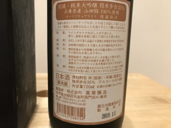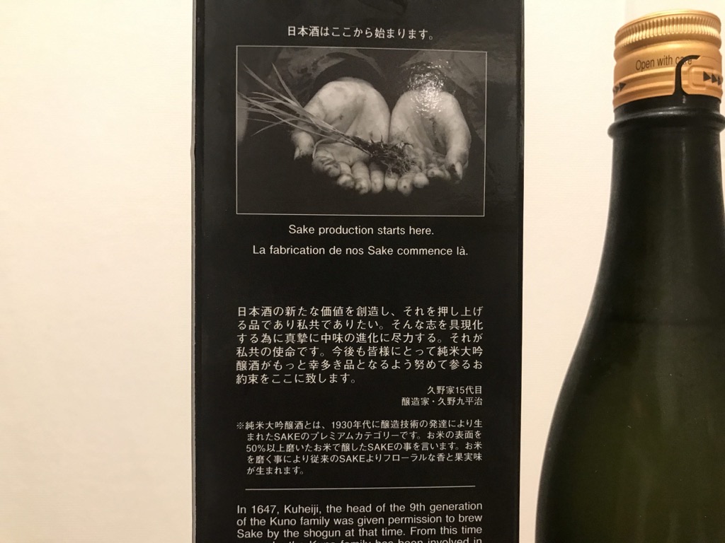 2020-07-28 日本酒 別誂 純米大吟醸 醸し人九平次 EAU DU DESIR 萬乗醸造 製造が2019/11で開けたのが今日なので半年以上経ってますね。 裏ラベルにワイングラスでと書いてあったので、冷やして、大きめのグラスで。 まずは甘み、そして適度な酸味とキレ とにかく甘みが強いですね。 九平次って開けてから何日か経ってからが美味しかった印象なのですが、一発目から美味しいです。 精米歩合:35% アルコール数:16%
