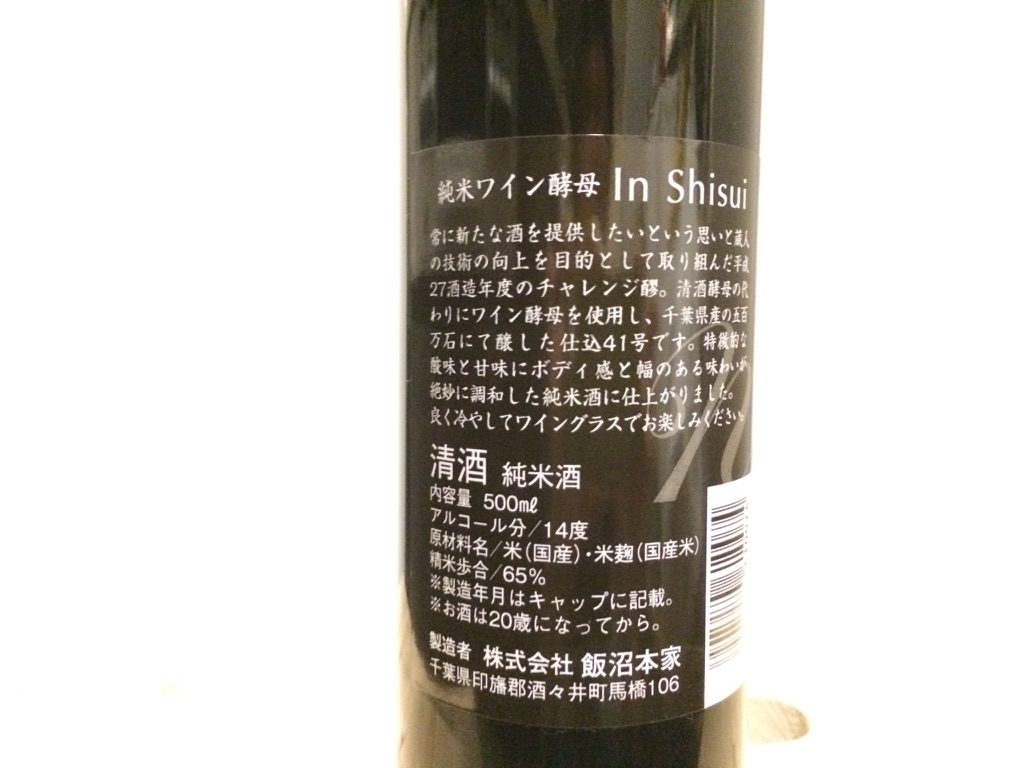 2016-11-22 日本酒 甲子正宗 純米ワイン酵母仕込み In Shisui 飯沼本家 ワイン酵母を使った純米酒です。 香りは普通の日本酒です。吟醸香的なものは特になし 口に含むとまさに白ワイン。 ワイングラスに入れて白ワインですよって言われたら気づかないかもです。 甘めで後味もすっきりしてとても飲みやすいです。 使用米:五百万石 精米歩合:65% アルコール数:14%