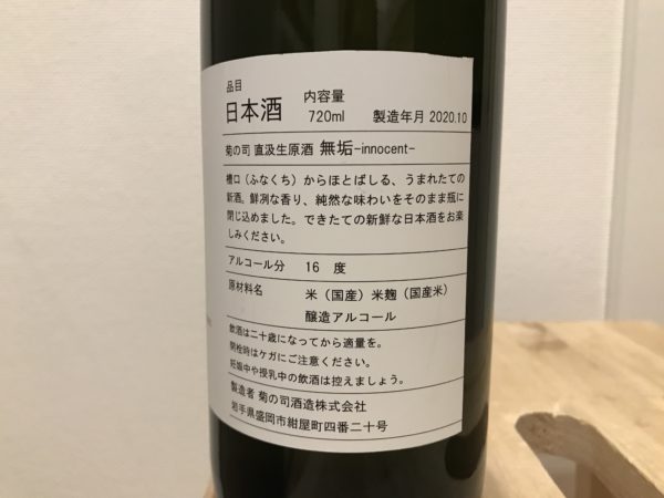 菊の司 直汲生原酒 無垢 innocent No.1 菊の司酒造
