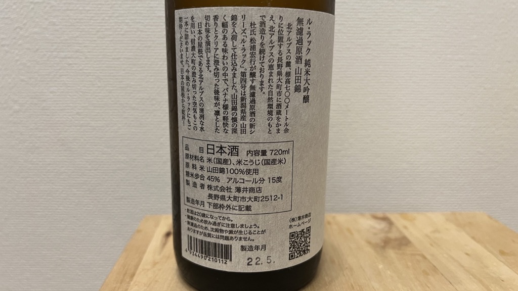 2022-06-17 日本酒 le lac ル・ラック 無濾過生原酒 純米大吟醸 山田錦 薄井商店 近くの酒屋に売っていて、見たことない銘柄だったので買ってきた これの他に米違いの純米吟醸が5種類くらい並んでて、迷った挙げ句山田錦の純大を買ってきた 香りは、ぶどうのような、ちょいフルーティー 味わいは、甘酸な自分好み ただ2日後に飲むと、酸味とアルコール感が増し、ちょっと個人的には微妙な感じに 使用米:山田錦 精米歩合:45% アルコール数:15%