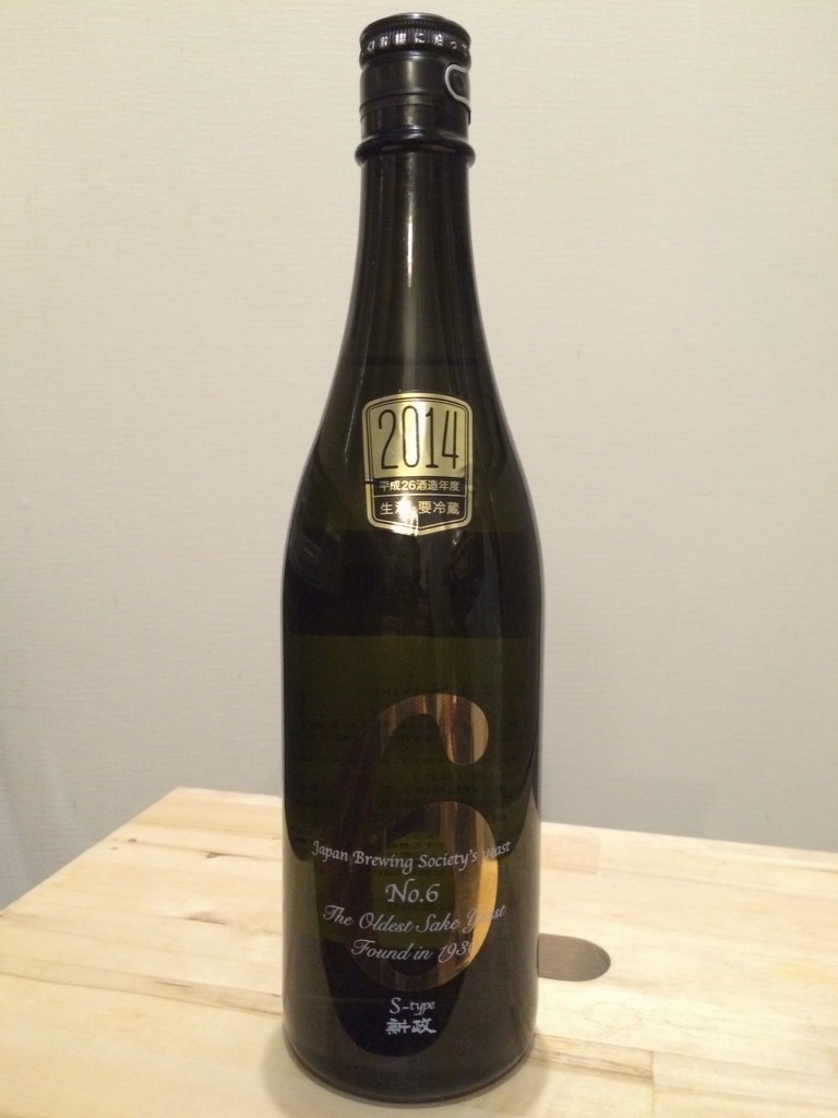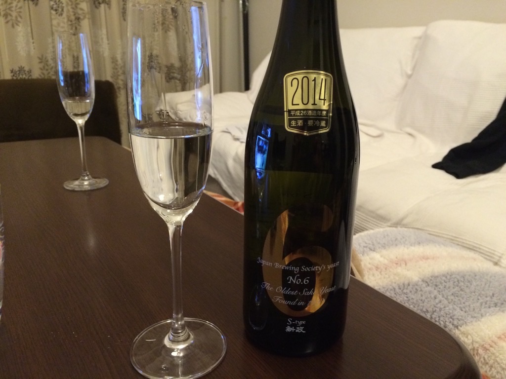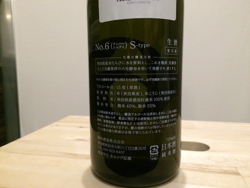 2015-01-31 日本酒 新政 No.6 S-type 純米吟醸 無濾過生原酒 新政酒造 微発泡でシャンパングラスが合います。 香りは強くなく、甘酸です。 生原酒なのにアルコール数が15%と低く、とても飲みやすいです。 二日目 炭酸が抜けて昨日よりまろやかに 精米歩合:40%(麹米)、55%(掛米) 酵母:協会6号 アルコール数:15%