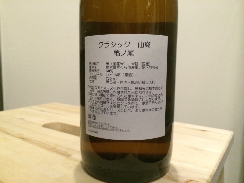 2014-11-07 日本酒 クラシック 仙禽 亀の尾 甘酸っぱいって感じです。 酸味がぴりりとさせますが、全体を引き締めていて飲みやすいです。 アルコール度数が若干低めなので、グイグイいけちゃいます。 吟醸香はかすかに香る程度 栃木県さくら市産亀の尾・特等米 精米歩合:50% アルコール:14~15度 無濾過・原酒、瓶囲い瓶火入 720mlで1620円