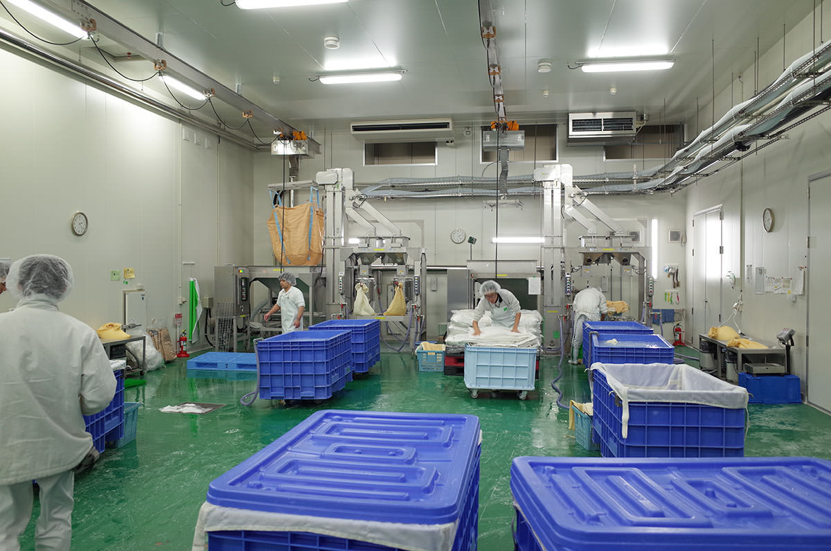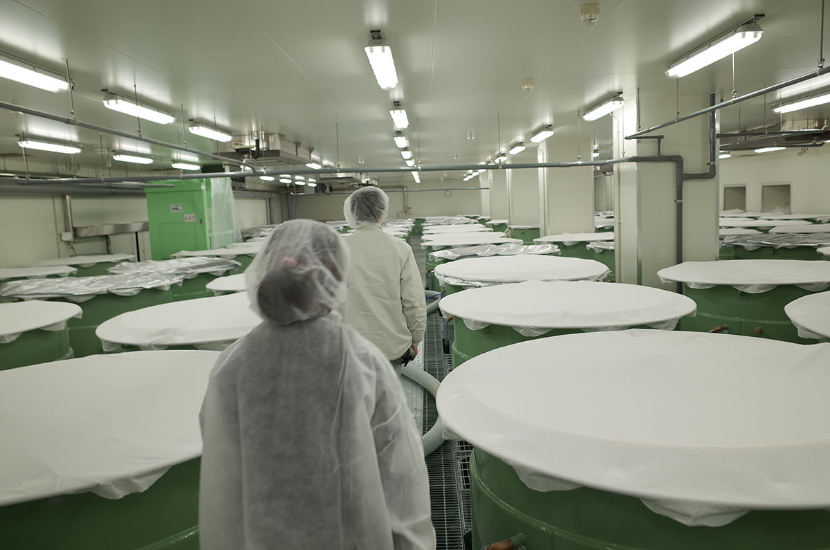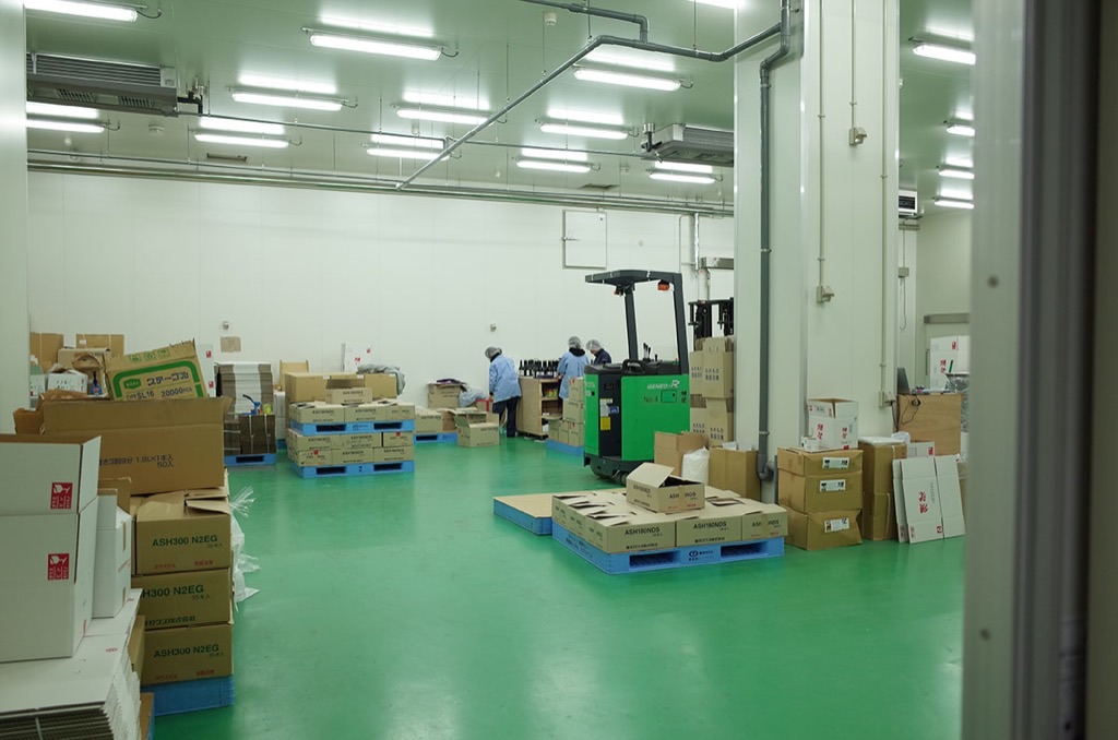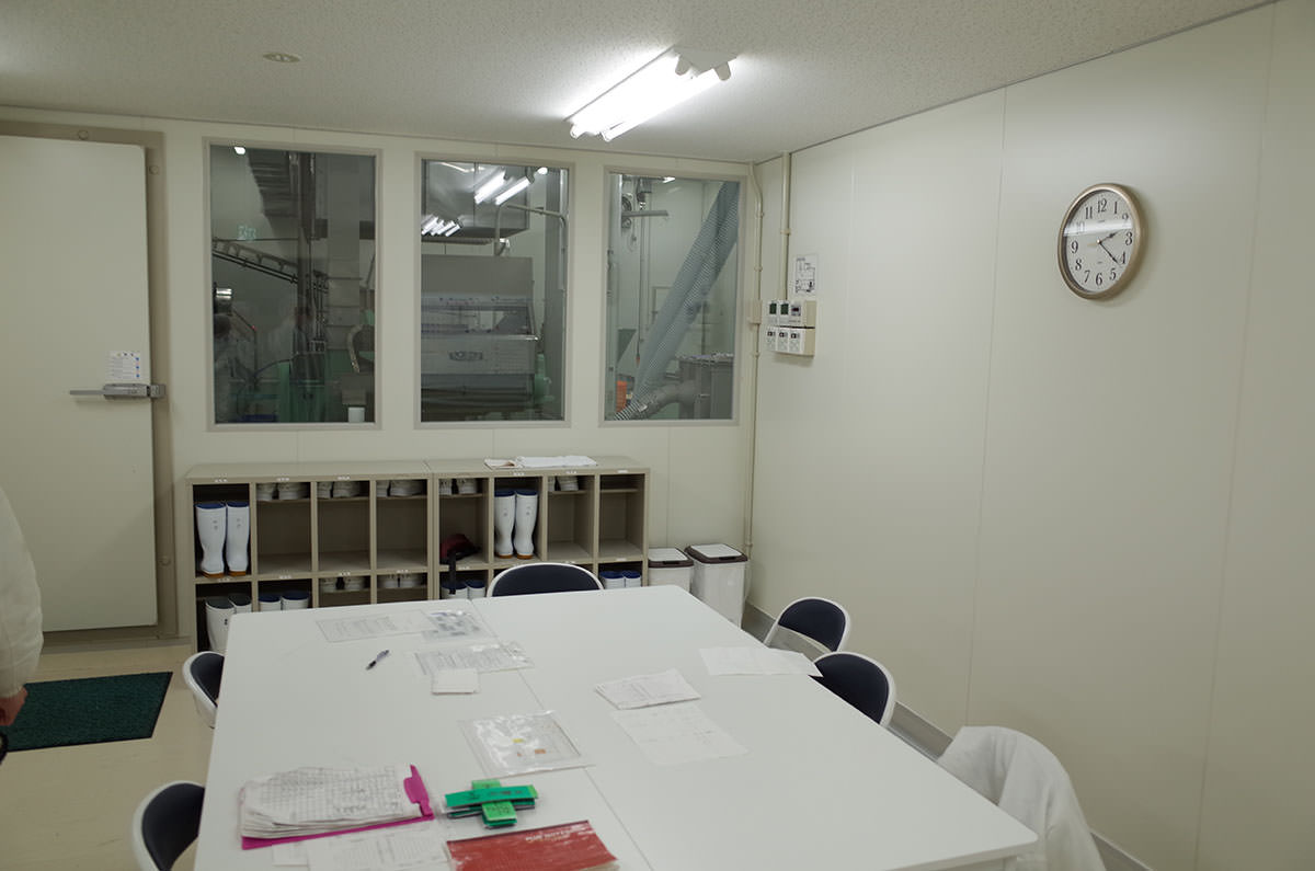 出荷室です。こちらでは従業員の方が磨き二割三分遠心分離の蓋のところに付いている紙を一つ一つ手作業で付けていました。