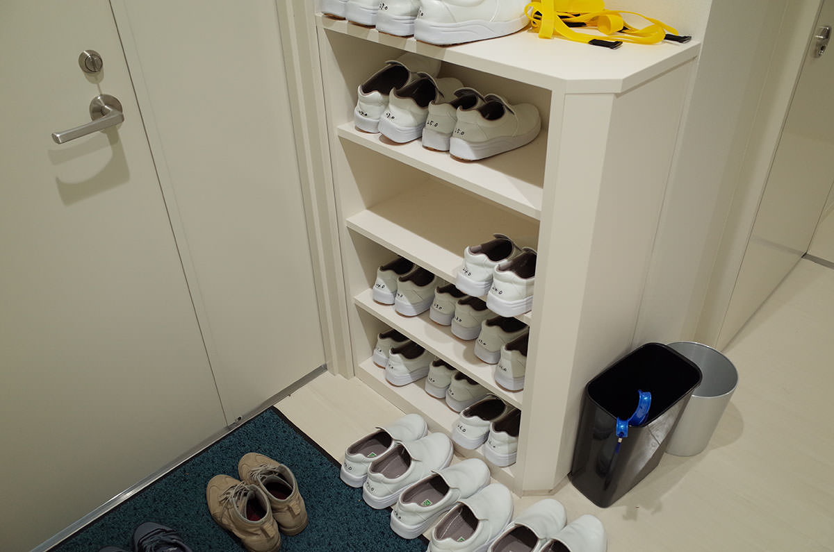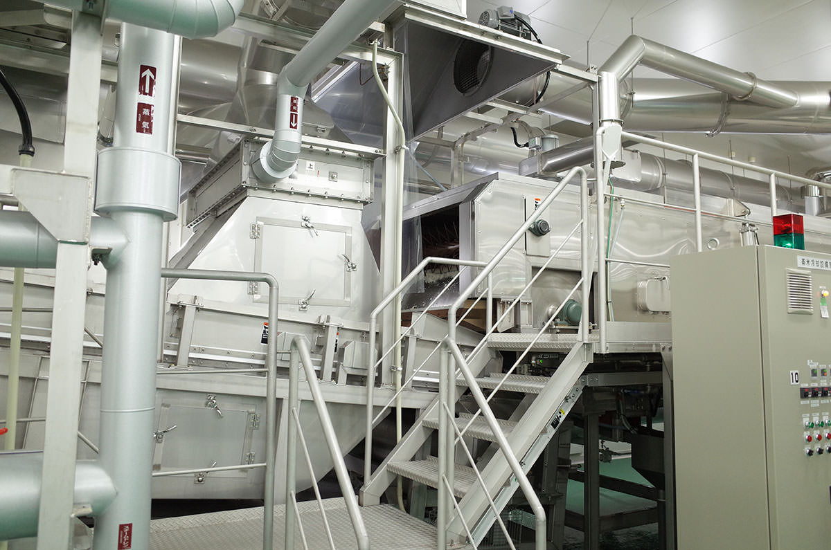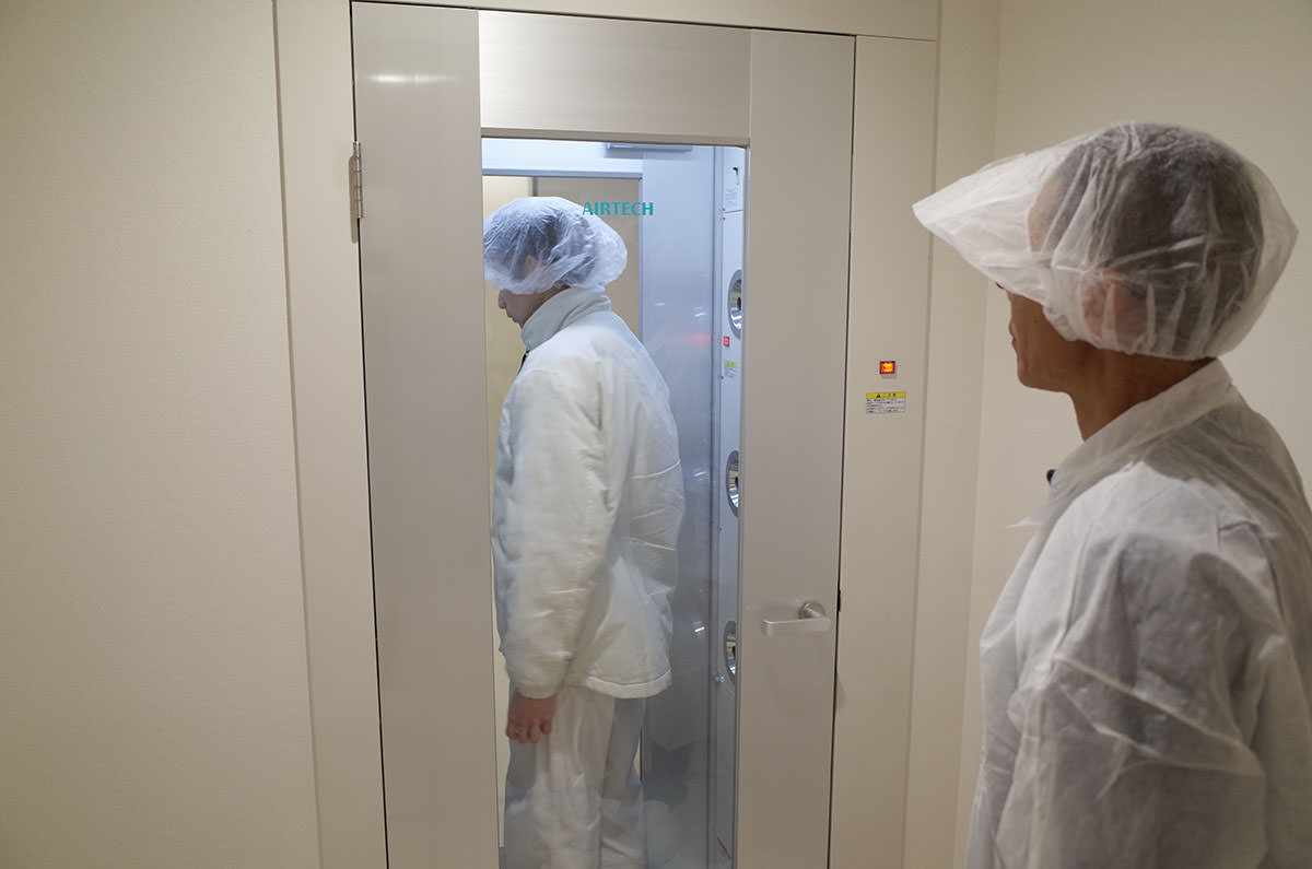 出荷室です。こちらでは従業員の方が磨き二割三分遠心分離の蓋のところに付いている紙を一つ一つ手作業で付けていました。