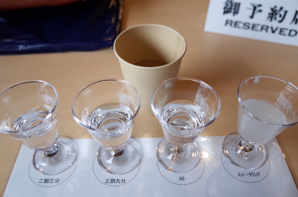 獺祭二割三分、三割九分、50、スパークリングが試飲できます。和らぎ水は獺祭の仕込み水です。