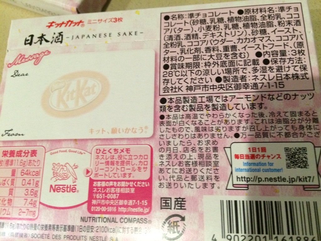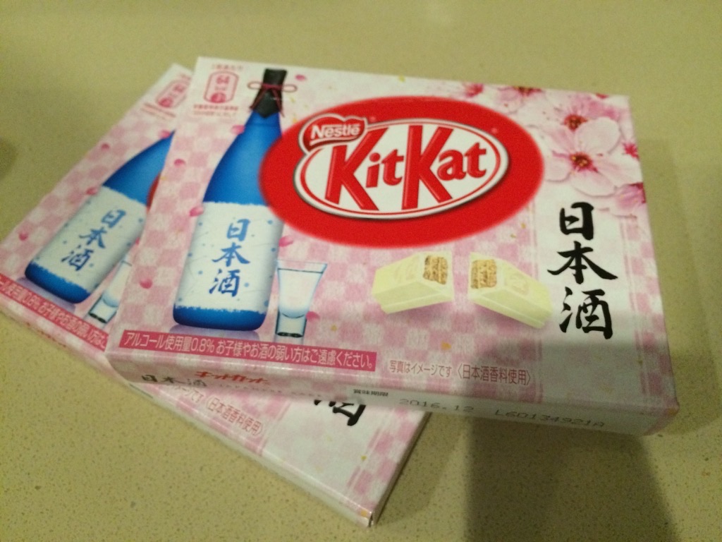2016-03-01 チョコレート キットカット日本酒 日本酒キットカットです。外国人観光客向けに作ったみたいですね。 結構人気で、なかなか買えませんでした。 日本酒パウダーが練りこまれた、ホワイトチョコレートで日本酒の香りがほのかに香ります。 アルコールは0.8%あるみたいです。 日本酒の銘柄はどこにも記載されていません。 せっかくなのでどこかとコラボして欲しかったですね。