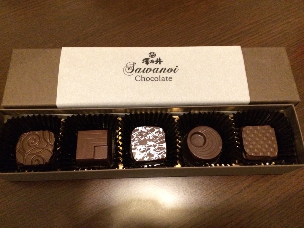 澤乃井のサイトにも記載されていますが、両端と真ん中がガナッシュ、左から2番めが澤乃井ボンボン、右側がダブルショコラとなっています。