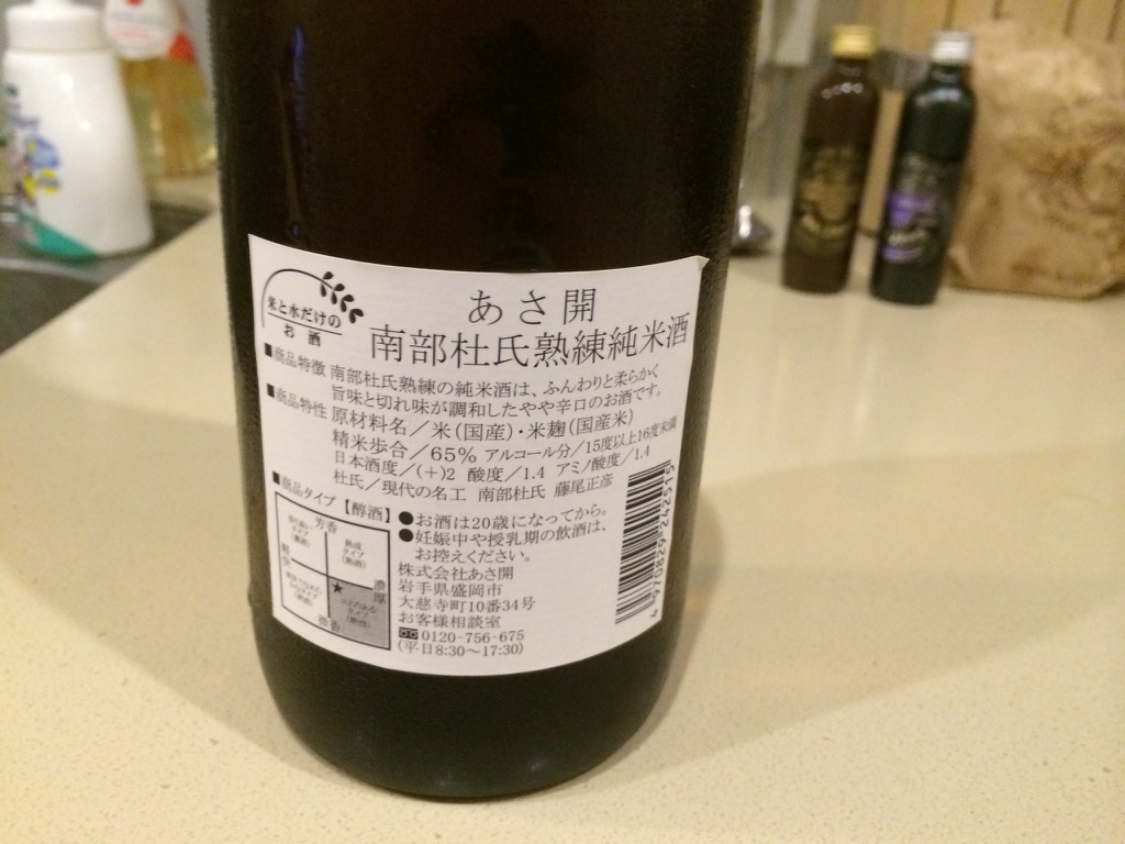 2014-10-21 日本酒 あさ開 南部杜氏熟練純米酒 近所のスーパーであさ開が売ってたので、買ってきました。 720mlで1000円以下なので結構リーズナブルなお酒 上善如水と似てる感じでスッキリしています。 後味に苦味が来ない分こっちのが飲みやすいのかもしれません。 ぬる燗にするとお酒っぽさがブワッとくるので、自分的には冷酒のがいいです。 使用米不明 精米歩合65% 日本酒度 +2 アミノ酸度 1.4 酸度 1.4 アルコール 15〜16%