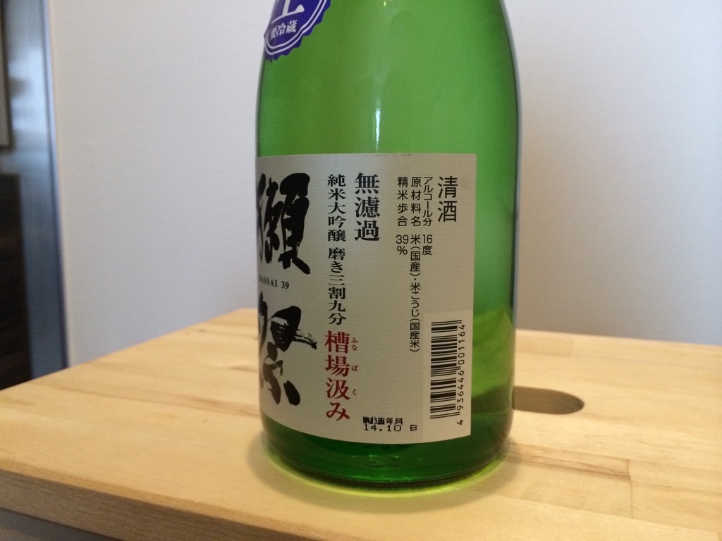 2015-01-01 日本酒 獺祭 純米大吟醸 磨き三割九分 槽場汲み(ふなばぐみ) 無濾過生原酒 獺祭が年2回出している限定酒です。無濾過生原酒はこの槽場汲みしかないらしく結構レアなお酒です。 香りはフルーティーなパイナップルのような香りですが、獺祭試よりも香りは強くなく落ち着いた感じです。 口当たりは滑らかでとても飲みやすいです。試よりもさらにスッキリとキレがいい感じがしました。 原料米:山田錦 精米歩合:39% アルコール度数:16度 720mlで2700円