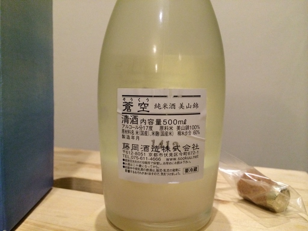 2015-01-02 日本酒 蒼空 純米酒 生酒 美山錦おりがらみ 藤岡酒造 ボトルがおしゃれな蒼空の純米生酒です。 香りは樽っぽい香りがします。 味はグレープフルーツのような柑橘系で、コクがあります。 微炭酸で酸味がやや強めです。 アルコール度数 : 17度 使用米 : 美山錦 精米歩合 : 60%