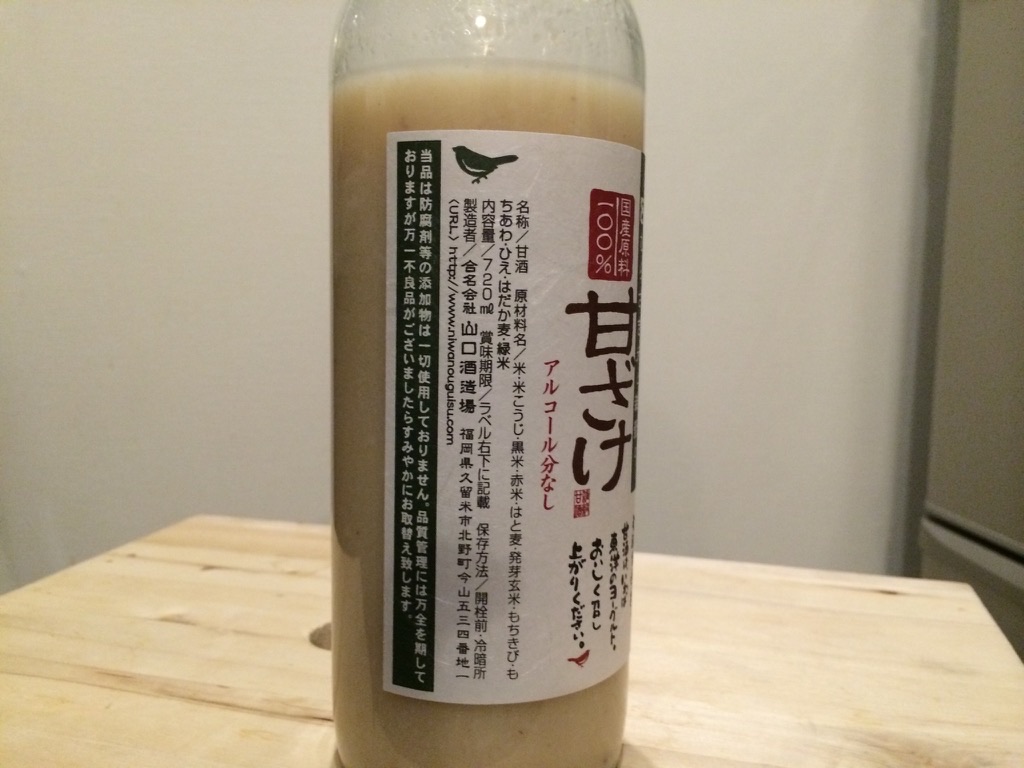 2015-01-05 甘酒 おいしい雑穀甘ざけ 山口酒造 庭のうぐいすで有名な福岡の山口酒造が作った雑穀甘酒です。 黒米、赤米、はと麦、発芽玄米、もちきび、もちあわ、ひえ、はだか麦、緑米が入っていて栄養価高そうです。 味わいは、けっこう酸味を感じました。
