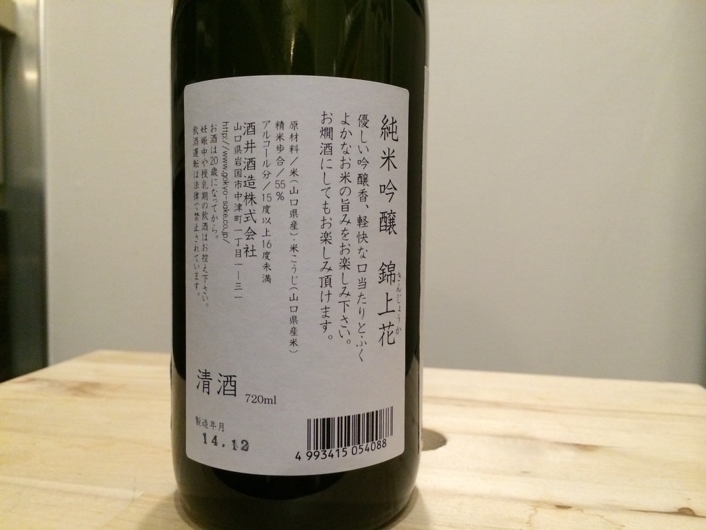 2015-01-10 日本酒 五橋 純米吟醸 錦上花 酒井酒造 香りがりんごのような、パインのようなフルーティーないい香りがします。 甘みが強くて、その後に来る酸がキリッと味を引き締めていてとてもおいしいお酒だと思います。 ラベルには「お燗にしても、、」と書いてありますが、冷酒で全部飲んでしまいました。 使用米:山田錦(山口県産) 精米歩合:55% 日本酒度:+2 ~ +3 酸度:1.5 ~ 1.6 アルコール数:15~16%