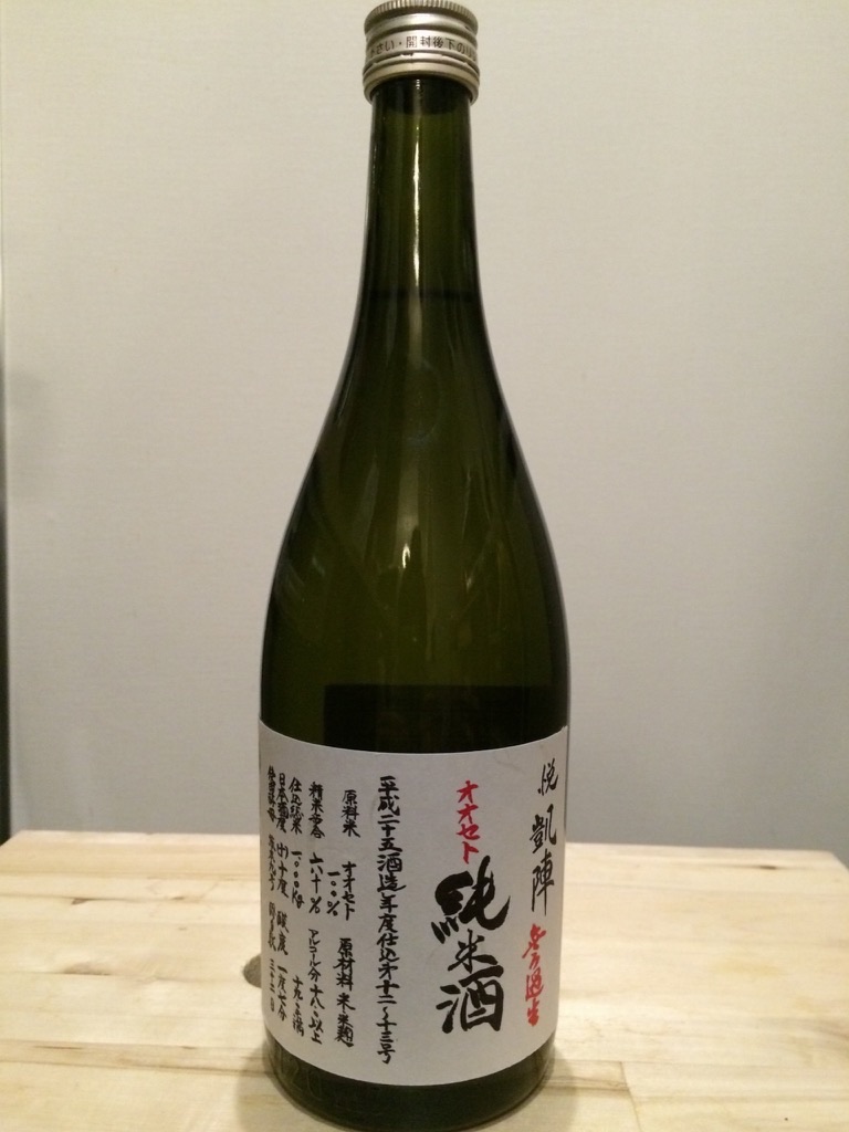 2015-02-08 日本酒 悦凱陣 純米酒 無濾過生酒 オオセト 丸尾本店 悦凱陣のオオセトの生酒です。相変わらずパンチがありますね。 日本酒度が+10ありますが、それほど辛味は感じず、甘旨酒って感じです。 冷酒で飲んだのですが、お燗も飲んでみればよかったです。 使用米:オオセト 精米歩合:60% 日本酒度:+10 酸度:1.7 酵母:熊本9号 アルコール数:18~19%