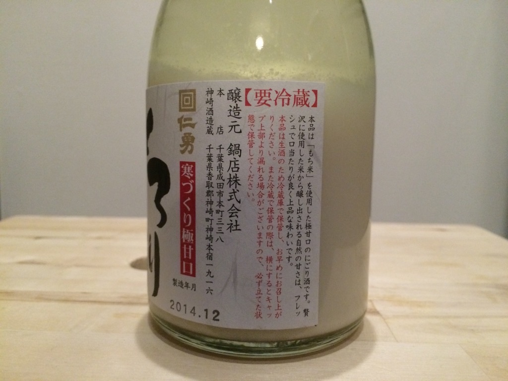 2015-02-20 日本酒 仁勇 寒づくり極甘口 とろり酒 鍋店株式会社 もろみの香りがふわっと香ります。 甘いです。甘酒にアルコール入れたみたいな感じです。 酸味があってアルコール感が立ちますね。アルコール数11%くらいなんだけど。 買ってきて冷蔵庫に1ヶ月半くらい入れてたんですが、もしかしたら生酒だからその間に発酵が進んで酸味が増したのかな、、 おいしいけど、甘すぎなのとアルコール感が強いのでたくさんは飲めないですね。デザート間隔のお酒。 使用米:美山錦・もち米・他 精米歩合:65% 日本酒度:-98 アルコール数:11%