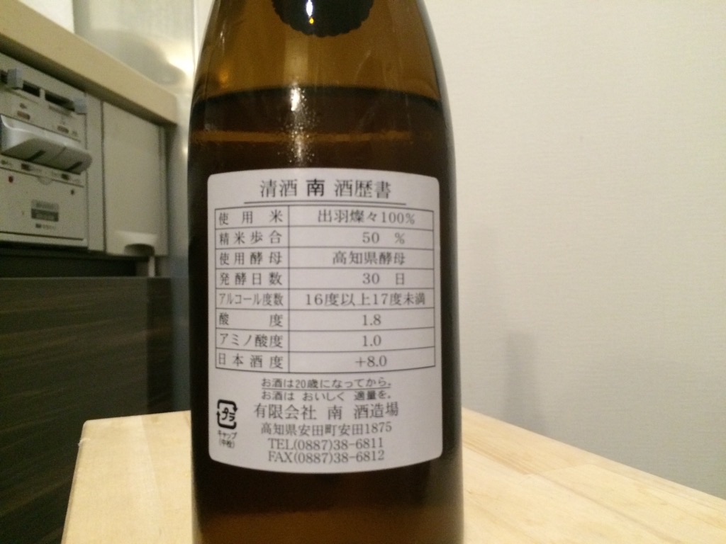 2015-02-22 日本酒 南 純米吟醸 生酒 出羽燦々 南酒造 出羽燦々を使った南のお酒です。 すっきりさっぱりの辛口ですが、アルコールが若干立つような感じがします。 使用米:出羽燦々 精米歩合:50% 日本酒度:+8.0 酸度:1.8 アミノ酸度:1.0 酵母:高知県酵母 アルコール数:16~17%