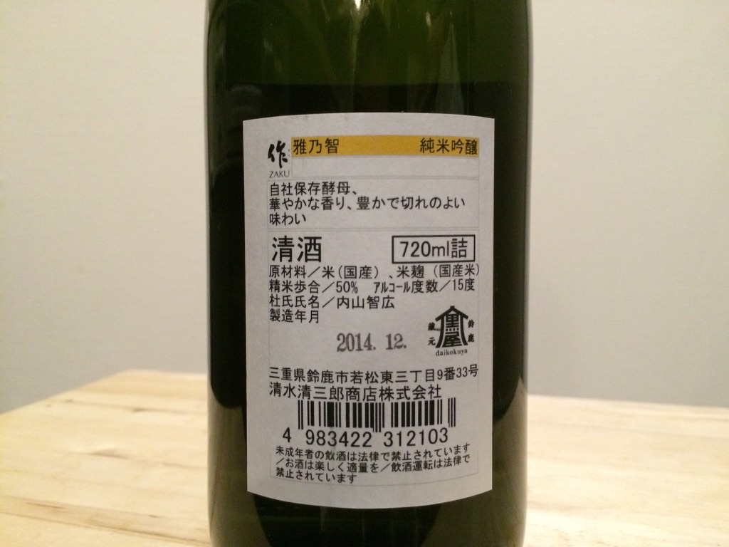 2015-02-28 日本酒 作(ざく) 雅乃智(みやびのとも) 純米吟醸 清水三郎商店 香りはりんごのような、フルーティーな香りです。 味わいは、甘みが強いですね。酸味辛味がほとんどなくとても飲みやすいです。 これアルコール数も少なめだし、グイグイいけちゃって飲み過ぎちゃいますね。 とても美味しいです。 使用米:国産 精米歩合:50% 酵母:自社保存酵母 アルコール数:15%