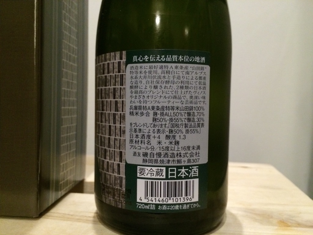 2015-04-04 日本酒 磯自慢 駿光の雫 純米吟醸 別囲い 磯自慢酒造 ヴィノスやまざきのオリジナル商品の磯自慢です。 香りはそこまで強くなく、飲み口はほのかな甘みで、酸味辛味が控えめで食中酒にぴったりです。 これはするするといってしまいますね。 原料米:兵庫県産山田錦 精米歩合:50% 日本酒度:+4 酸度:1.3 アルコール数:15~16%
