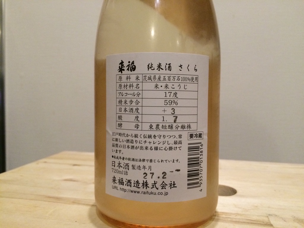 2015-04-25 日本酒 来福 純米酒 さくら酵母 桜の花酵母のせいか、若干ピンク色がかっていて、匂いもチェリーのような匂いがします。 味わいは、酸味があって、アルコール感が立っています。甘み辛味もほどほどに。 少し置いて、常温に近づいてくるとまろやかになっていきます 使用米:五百万石 精米歩合:59% 日本酒度:+3 酸度:1.7 アルコール数:17%