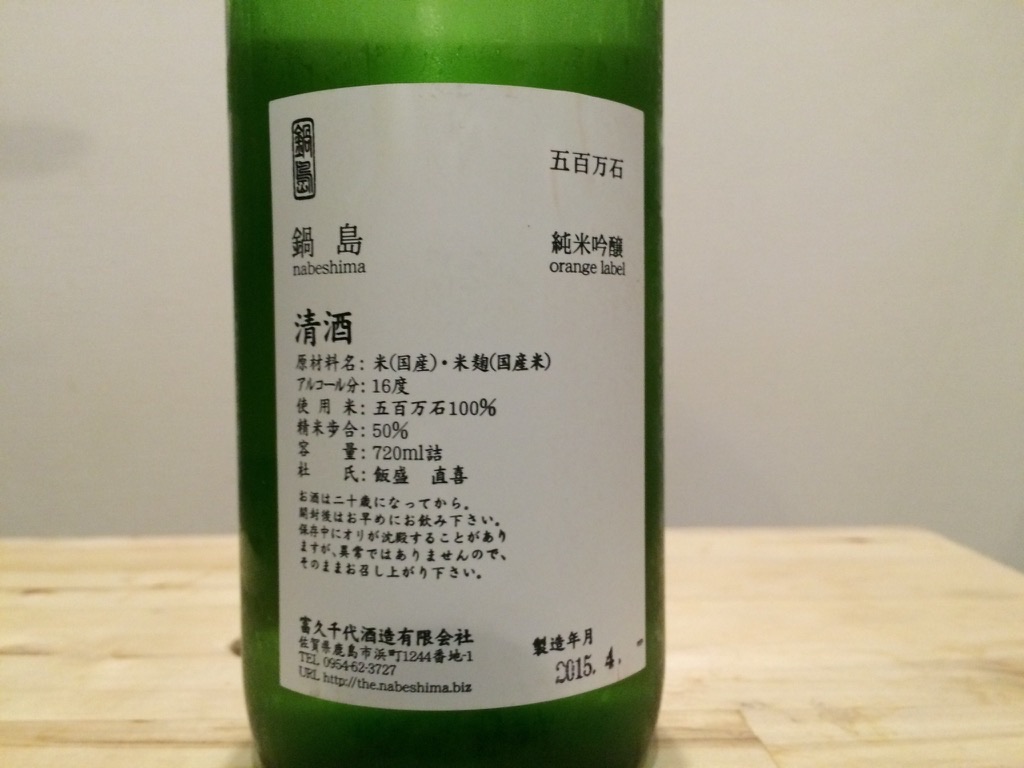 2015-04-30 日本酒 鍋島 純米吟醸 五百万石 富久千代酒造 通称鍋島オレンジです。 香りは控えめで、甘み酸味が強いです。 五百万石なのですっきり目かと思いきや、味が濃いというか、コクがありますね。 料理と合わせると、酸味が増しピリリと感じました。 使用米:五百万石 精米歩合:50% アルコール数:16%
