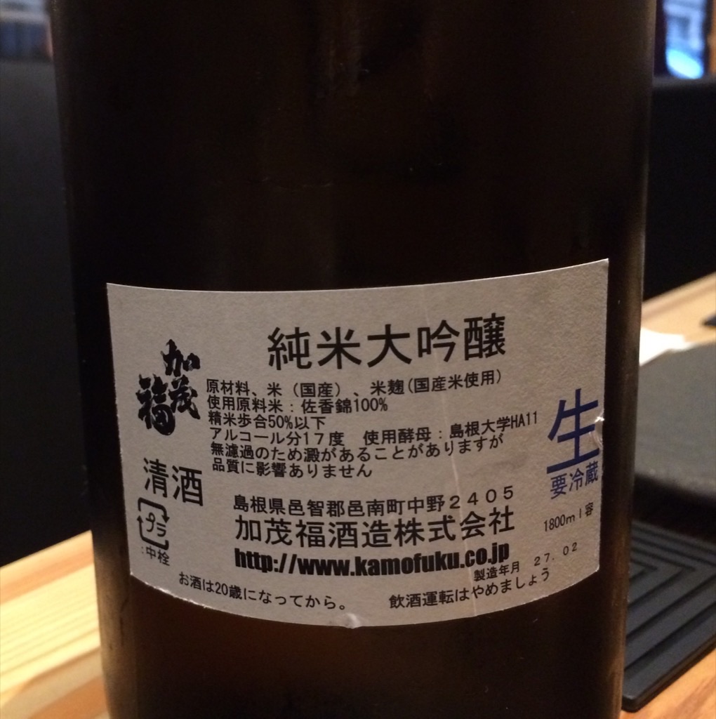 2015-05-04 日本酒 裏死神 純米大吟醸 加茂福酒造 ノーマル死神とは裏腹に、フルーティーなお酒です。 リンゴのような味わいでとても美味しかったです。 料理と合わせても美味しくいただけます 使用米:佐香錦 精米歩合:50%以下 酵母:島根大学HA11 アルコール数:17%