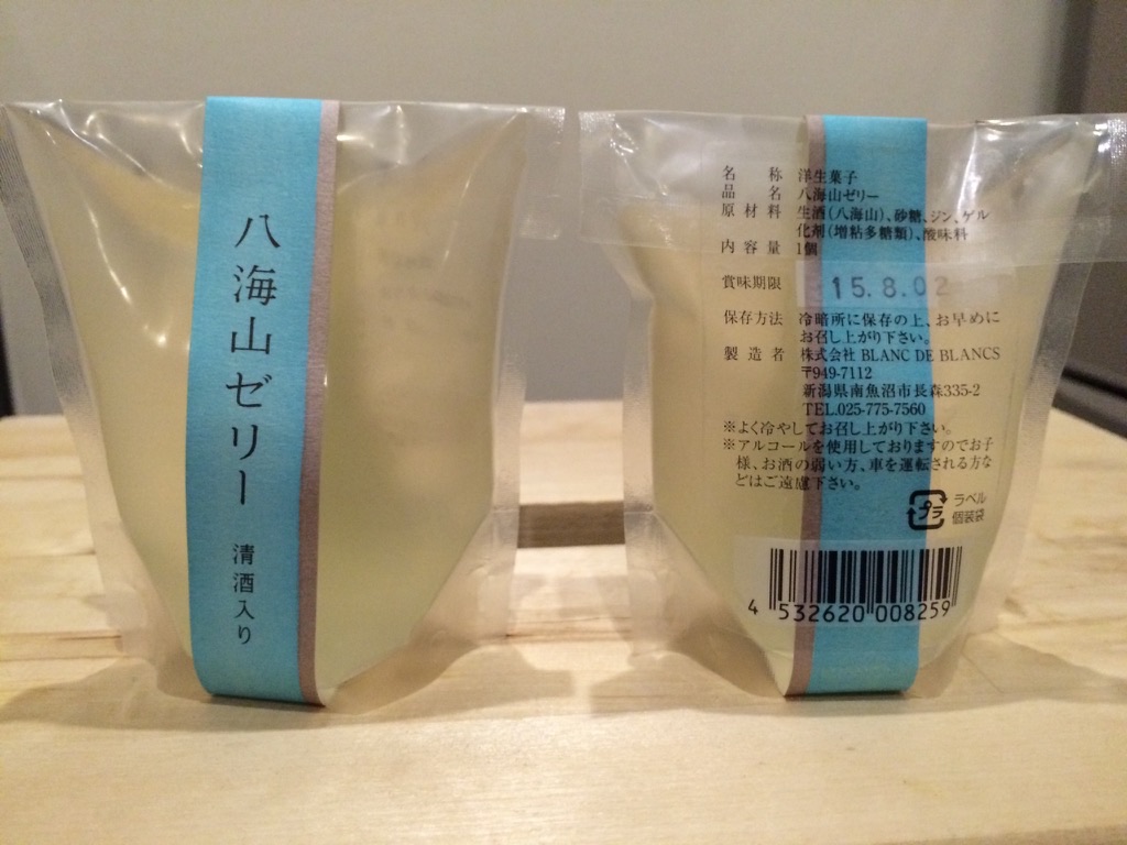 2015-07-06 その他 八海山ゼリー 八海山のゼリーです。 ラベルにはアルコール数記載してないのですが、店頭のPOPによると5%とのこと 八海山をそのままゼリーにして甘くした感じでおいしいですが、鼻から抜けるアルコール臭が結構立っていて、それがなければいいのになと思いました。
