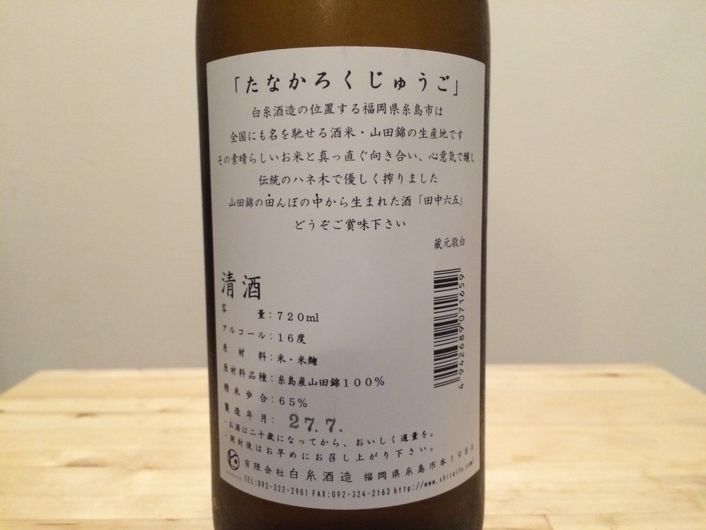 2015-08-30 日本酒 田中六五 白糸酒造 香りはほどほど 甘みは少なめで、飲み込んだ後も口にしばらく辛味なのか酸味なのかが残ります。 これがキレが悪いってことなのかな 自分的にはちょっと期待はずれ 使用米:山田錦 精米歩合:65% アルコール数:16%