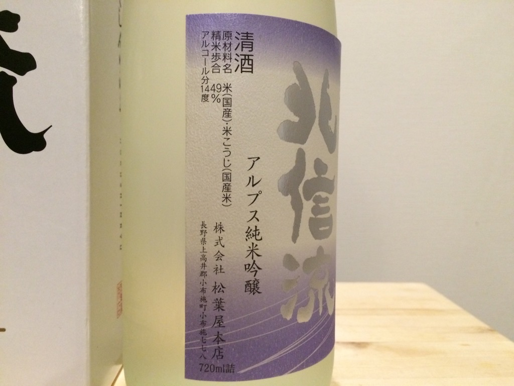 2015-08-30 日本酒 北信流 アルプス純米吟醸 松葉屋本店 とてもスッキリしていて軽い感じです。 アルコール度数が14度と低いせいでしょうか 悪く言うと薄いなーって感じ 使用米:美山錦 精米歩合:49% 日本酒度:+2 酸度:1.3 アルコール数:14%