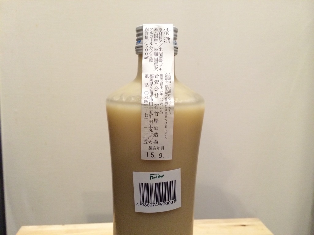 2015-12-31 その他 むろまち祝い酒 若竹屋酒造場 甘酒のようだけど、アルコール3%というどぶろくのようなお酒 まず、とにかく蓋が固くて開けるの大変だった 味は甘いけど酸っぱい ほんと甘酒とどぶろくの中間のようなお酒 うーん、、、なんかどっちつかずで中途半端な感じ 原料米:米、もち米 アルコール感:3%