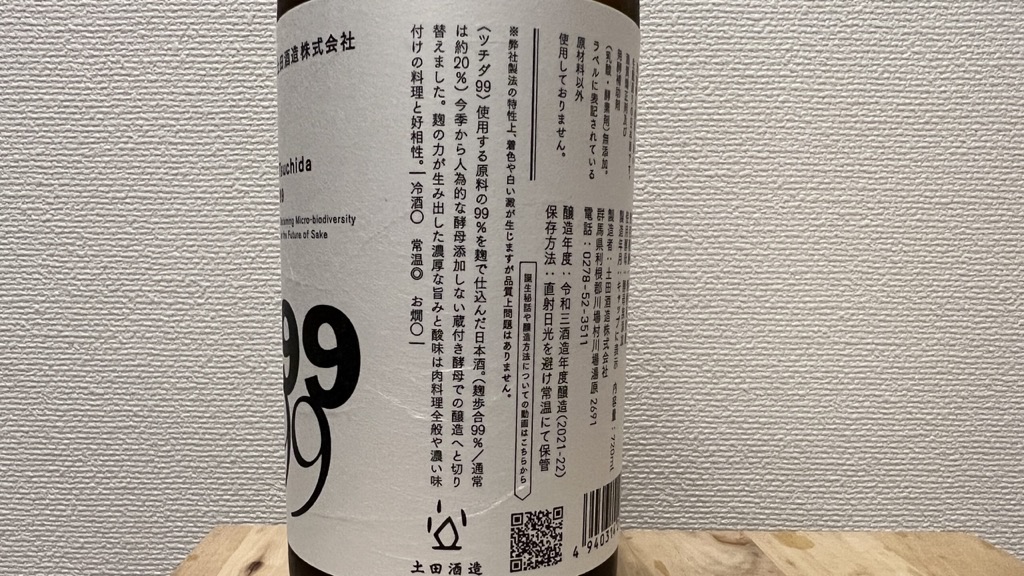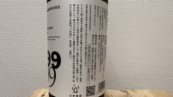 2022-10-07 日本酒 Tsuchida99 ツチダ99 土田酒造 こちらも蔵元へ酒蔵見学しに行って、直接買ってきたお酒 麹99%で作られたお酒 それだけでも甘そうなイメージ 色は熟成されたような黄色みがかっている 味わいはたしかに甘い 醤油のようなみりんのような風味 常温以上のほうが美味しいのかもしれない 自分はちょっと苦手 精米歩合:70% アルコール数:13%