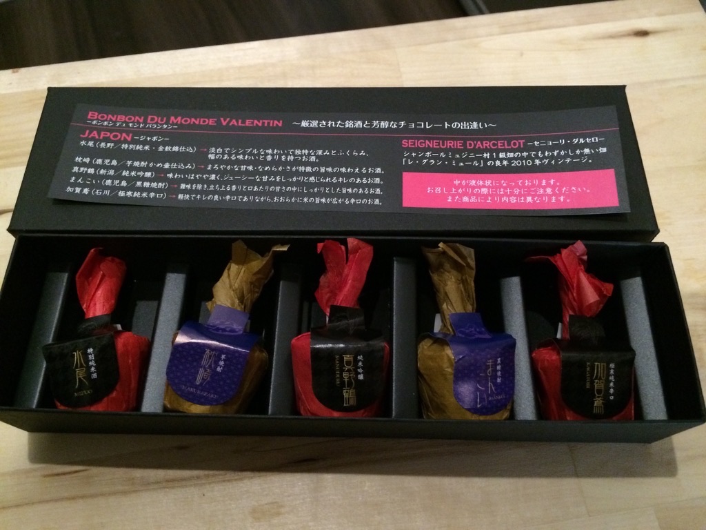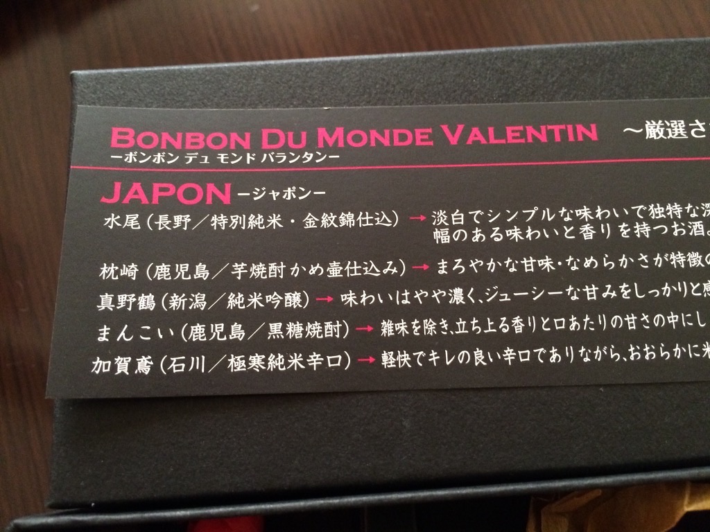 2015-02-11 チョコレート Valentine's Bar 日本酒ボンボン チョコレート 水尾 真野鶴 加賀鳶 三越が出している、バレンタイン用の日本酒チョコレートボンボンです。 日本酒が、水尾、真野鶴、加賀鳶の3つと焼酎が2つ入っています。 このチョコは白川郷のみたいに、砂糖コーティングされていないので、お酒がチョコレートに直に入っていてとても美味しいです。 日本酒ボンボンは他のお酒ほど、ぶわっとお酒感が強くなくてほんのり香るのでいいですね。 お酒好きの人にプレゼントするにはピッタリのバレンタインチョコだと思います。 獺祭チョコよりこっちのがいいと思う。